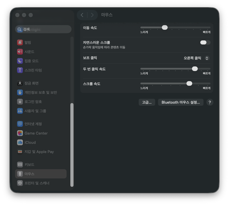 설정에 들어가 왼쪽 메뉴중에 마우스를 선택하고