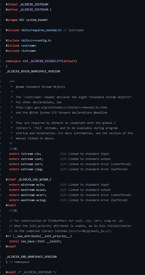 기본적으로 C++에서 #include <iostream>을 넣어야 한다. 이것은 iostream.h라는 헤더파일을 포함하겠다는 뜻이다. 이것을 넣어야 cin, cout과 같은 객체를 해당 헤더에서 제공받아 사용할 수 있다. 그렇다면 iostream에는 무엇이 쓰여 있을까?