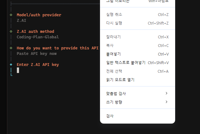 나는 z.ai 의 glm을 연결하기 때문에 Z.AI를 선택했다.