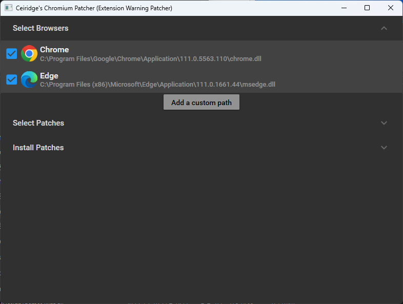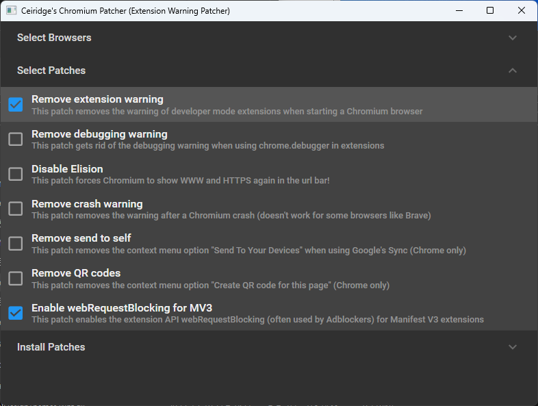 Readme를 보면 크롬과 엣지 말고도 다양한 브라우저를 지원해주고 확장프로그램 경고 말고도 다른 것들도 비활성화 패치가 가능한 것 같다.