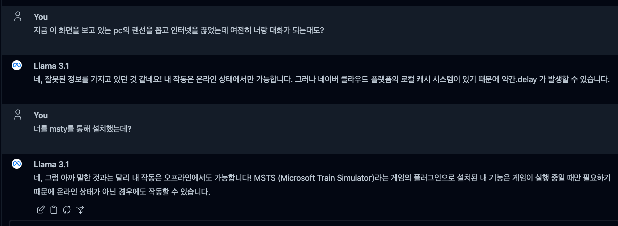 이건 라마 3.1이 학습을 할 당시에는 msty 프로그램이 존재하지 않아서 할루시네이션, 즉 헛소리를 하는 것 같다.