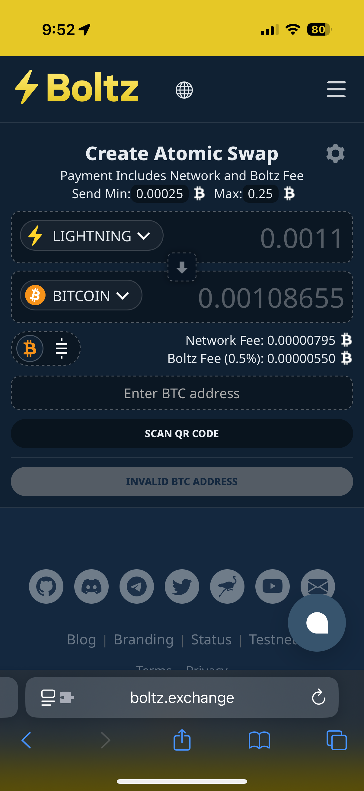 Boltz 웹사이트로 접속하면 바로 스왑 페이지가 반긴다.